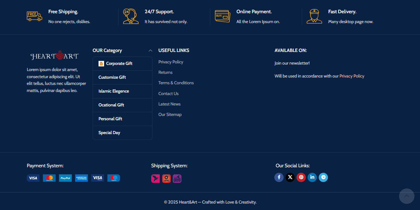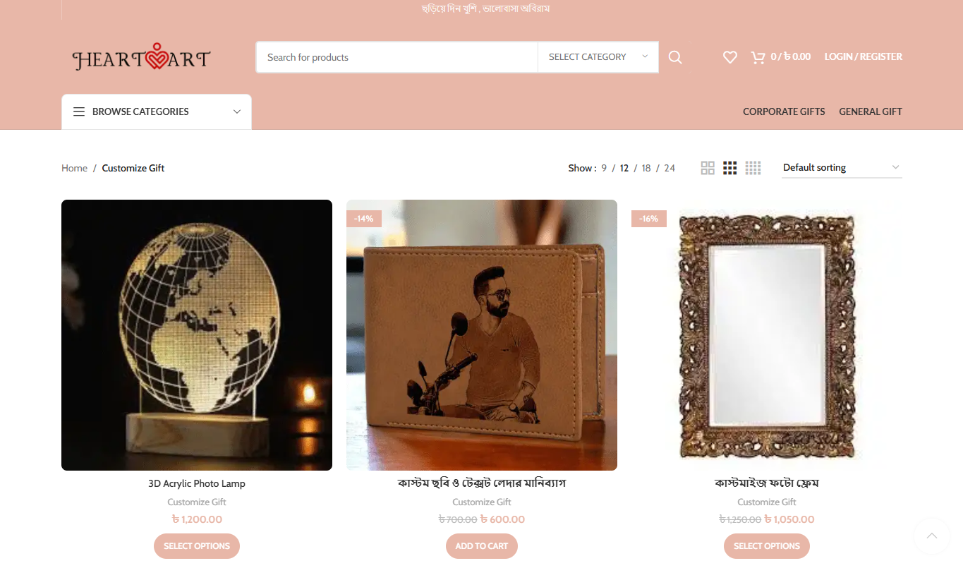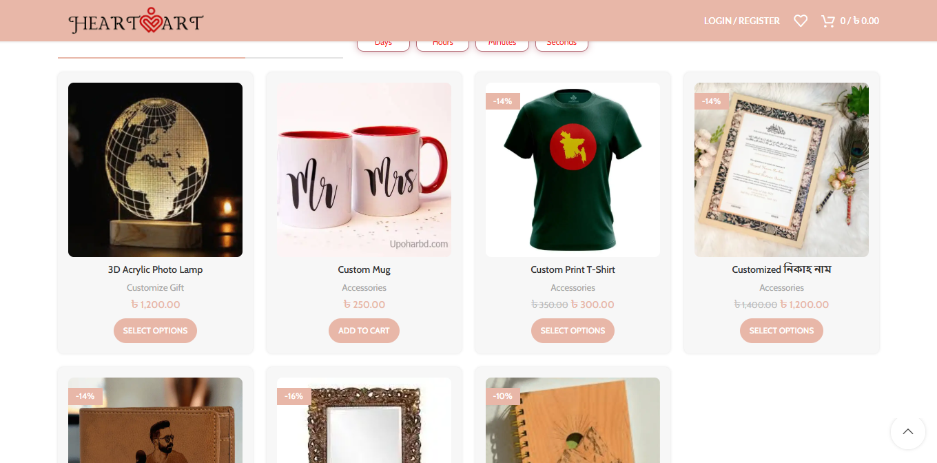 Heart&Art is a vibrant e-commerce platform designed to simplify the art of gifting. The website is structured around specific occasions—such as Valentine’s Day, Ramadan, and Birthdays—making navigation intuitive for shoppers looking for timely presents. The design features a warm, inviting color palette and integrates urgency-marketing tools like countdown timers for each seasonal offer. Key functionalities include product customization options (for items like mugs and photo frames), bilingual support (English & Bengali), and a robust footer highlighting trust indicators like shipping guarantees and secure payment methods.